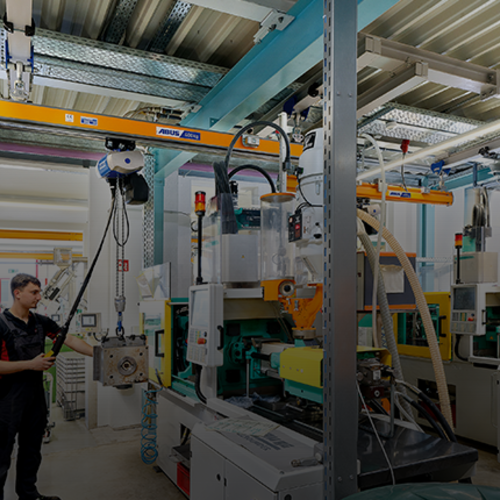 Système de convoyeur suspendu d'une capacité de 500 kg dans la menuiserie Lorenz Système de voie suspendue avec palan à chaîne électrique ABUCompact GM2 dans une menuiserie allemande Un employé travaille avec le système HB dans la menuiserie Lorenz en Allemagne Système HB avec pont bipoutre ZHB sur chemin de roulement de 12 m de long Pont bipoutre avec entraînement électrique pour un positionnement précis