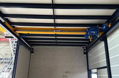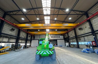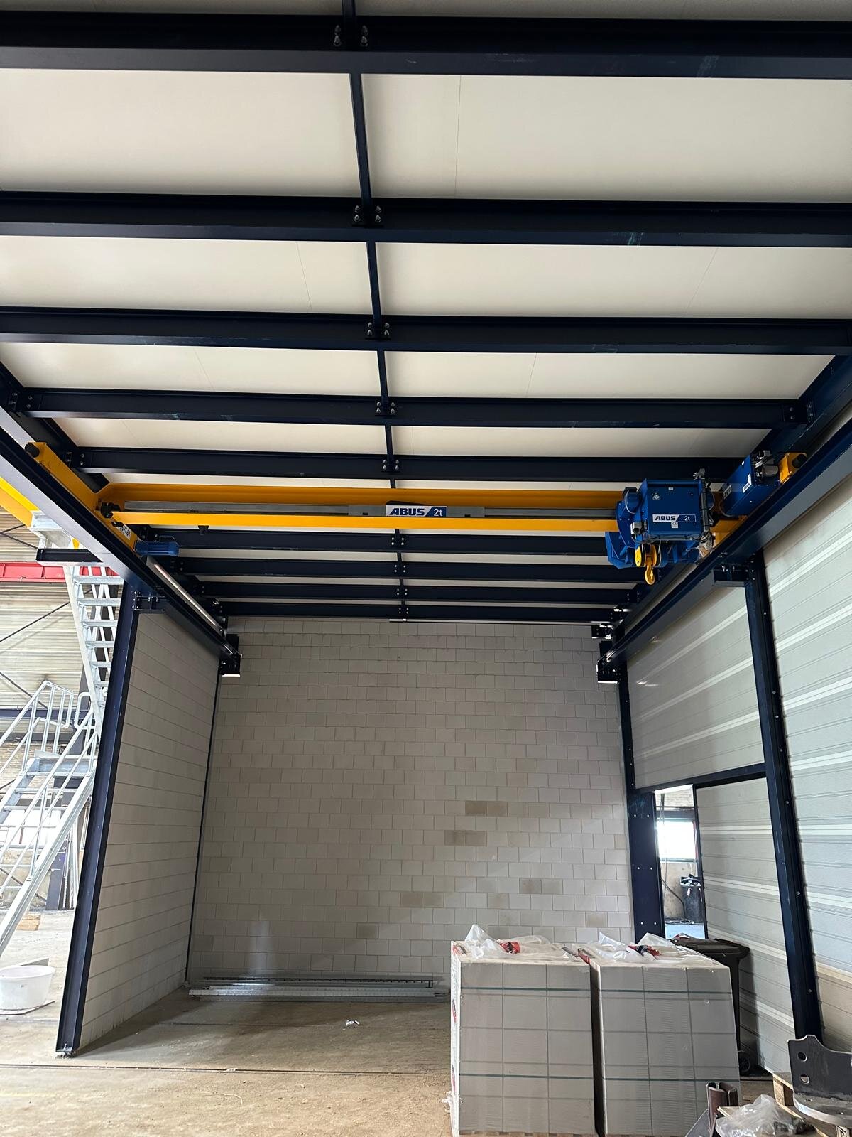 - Trois semi-portiques monopoutres, d’une capacité de levage de 5 tonnes chacun, complètent l’installation. Ces équipements sont parfaitement adaptés au déplacement efficace de pièces dans des zones spécifiques du hall, offrant un flux de travail flexible tout en maintenant des performances de levage élevées.