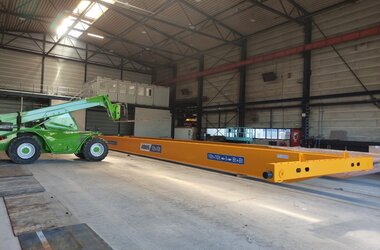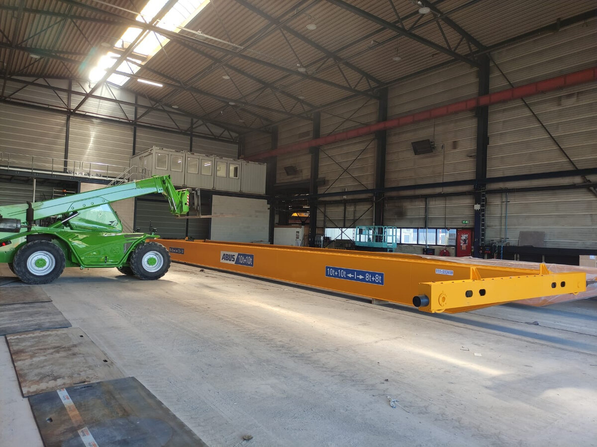 - Deux ponts roulants bipoutres équipés de palans électriques à câble double ont été installés. Chaque palan offre une capacité de levage allant jusqu’à 10 tonnes lorsque la charge est positionnée au centre du pont roulant. En raison de la configuration du hall, la capacité maximale est limitée à 8 tonnes par palan en dehors des zones spécifiquement identifiées. Cette installation permet la manutention sécurisée de composants longs et lourds, tout en garantissant une grande flexibilité d’utilisation dans l’espace de travail.